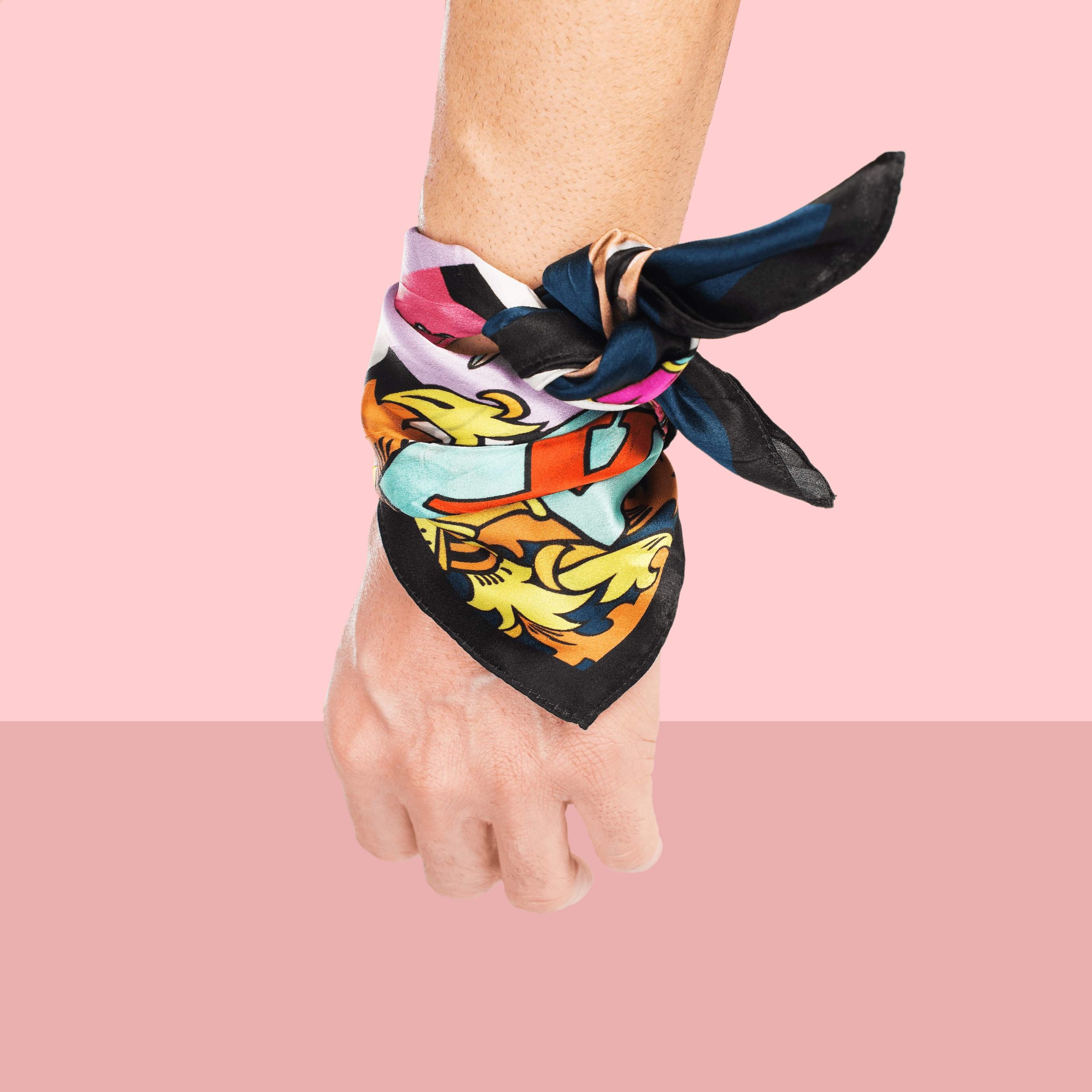 Vivace e versatile foulard da collo, indossabile anche al polso, tra i capelli o su borsa.
